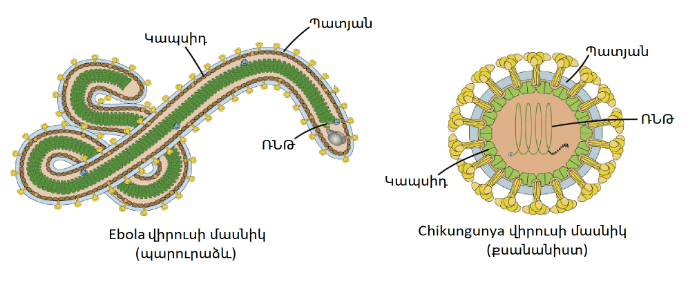 - բոլոր վիրուսներն ունեն գենետիկական նյութ՝ ԴՆԹ կամ ՌՆԹ։ Սրանք երկար մոլեկուլներ են, որոնք կրում են գենետիկական տեղեկատվությունը,